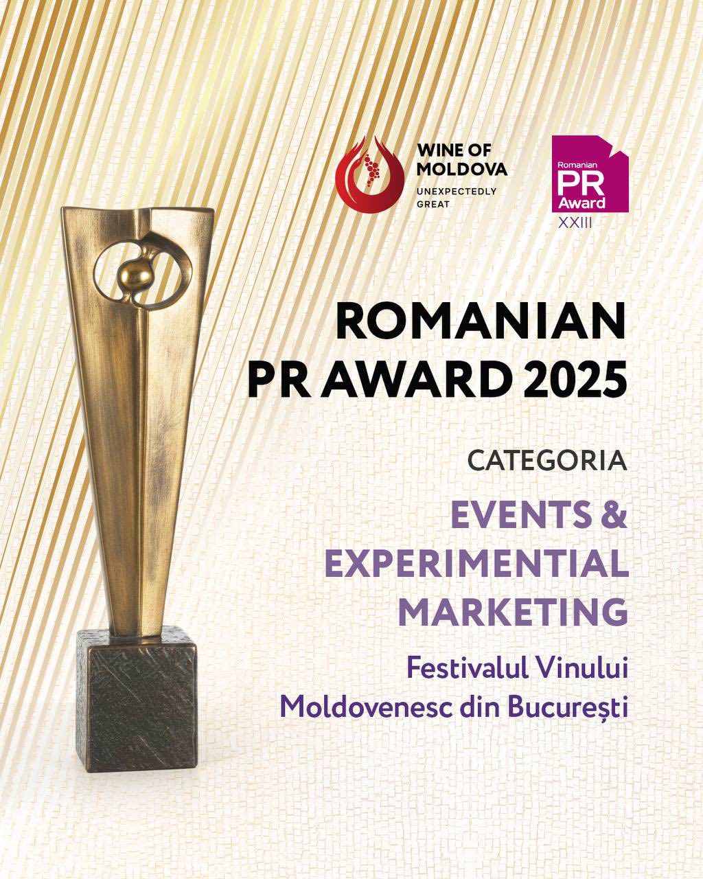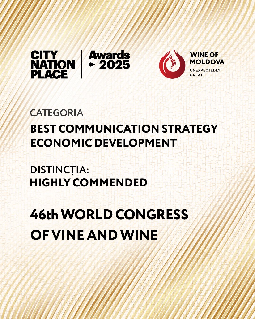 „Este vorba de London City Nation Place – Highly Commended, categoria Best Communication Strategy: Economic Development. Premierea reprezintă o apreciere a modului în care Republica Moldova a organizat, promovat și comunicat cea de-a 46-a ediție a Congresului Mondial al Viei și Vinului, considerat cel mai important eveniment științific internațional dedicat sectorului. Dosarul a fost depus de Agenția de Investiții din Moldova. Şi a doua - Romanian PR Award – Diploma de excelență, categoria Events & Experimental Marketing. Distincția a vizat Festivalul Vinului Moldovenesc de la București, un proiect care a contribuit semnificativ la creșterea vizibilității vinului moldovenesc pe piața regională și la promovarea imaginii Republicii Moldova ca producător de vinuri de calitate. Materialele au fost înaintate spre jurizare de Seven Media Communication Partner SRL”, explică ONVV.