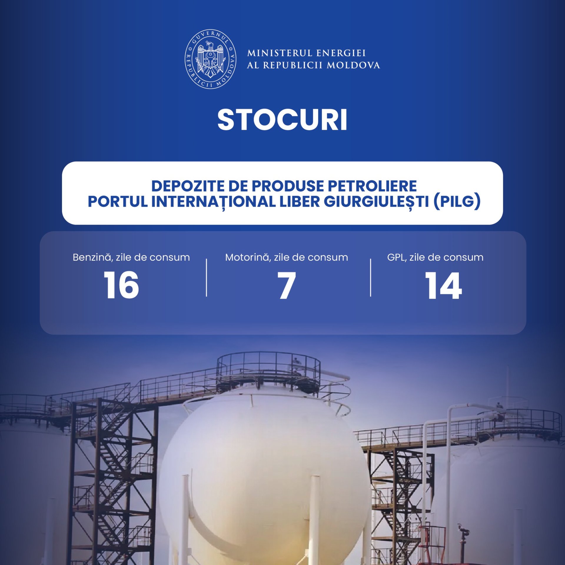 Potrivit datelor Ministerului Energiei, stocurile de carburanți au constituit 16 zile pentru benzină, 14 zile pentru gaz petrolier lichefiat și 7 zile pentru motorină.