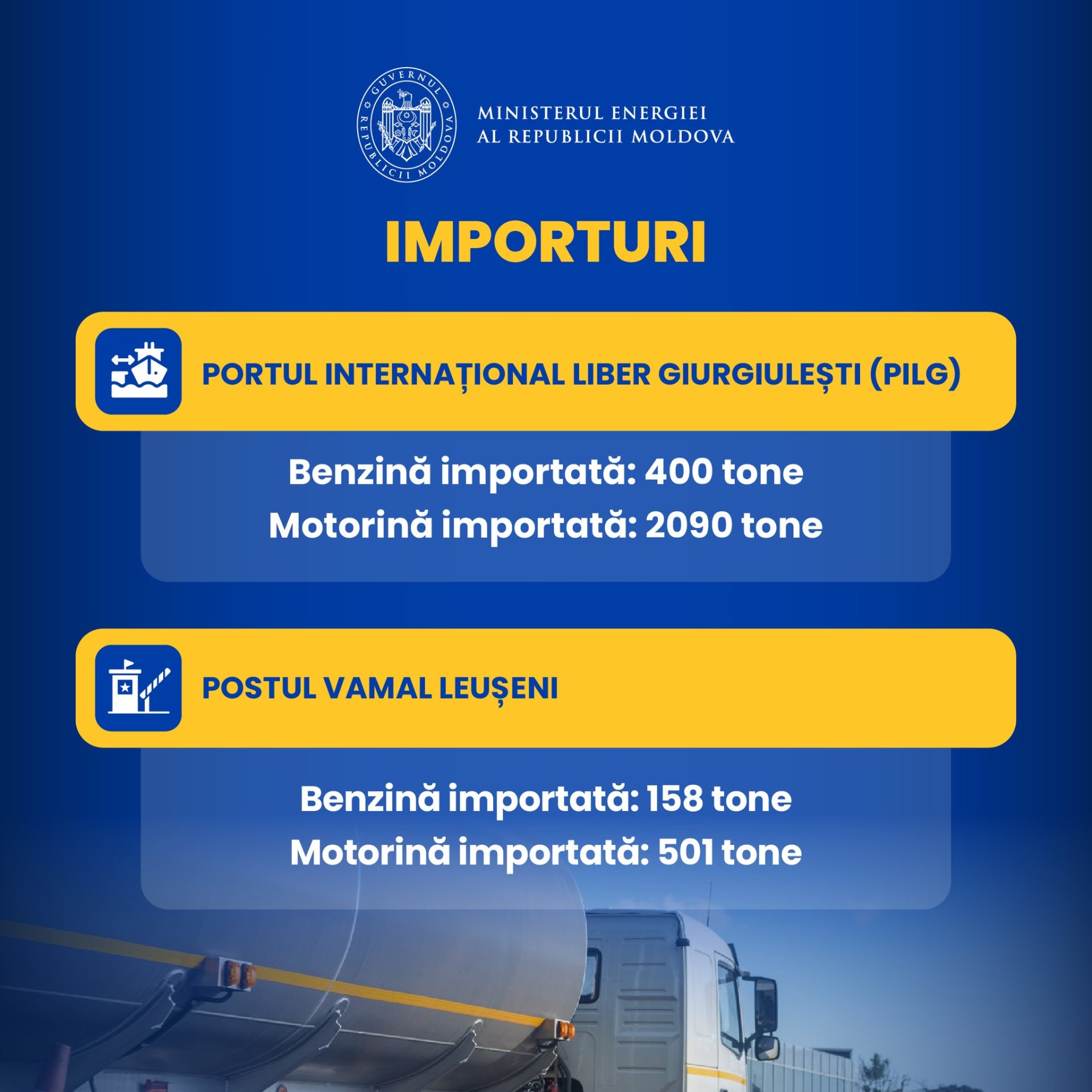Aproape 2600 tone de motorină și 558 tone benzină au fost importate marți, 17 martie, în Republica Moldova prin Portul Internațional Liber Giurgiulești și cu transport terestru. Premierul Alexandru Munteanu a declarat astăzi, la începutul ședinței de Guvern, că situația din domeniul energetic este una stabilă, informează MOLDPRES.