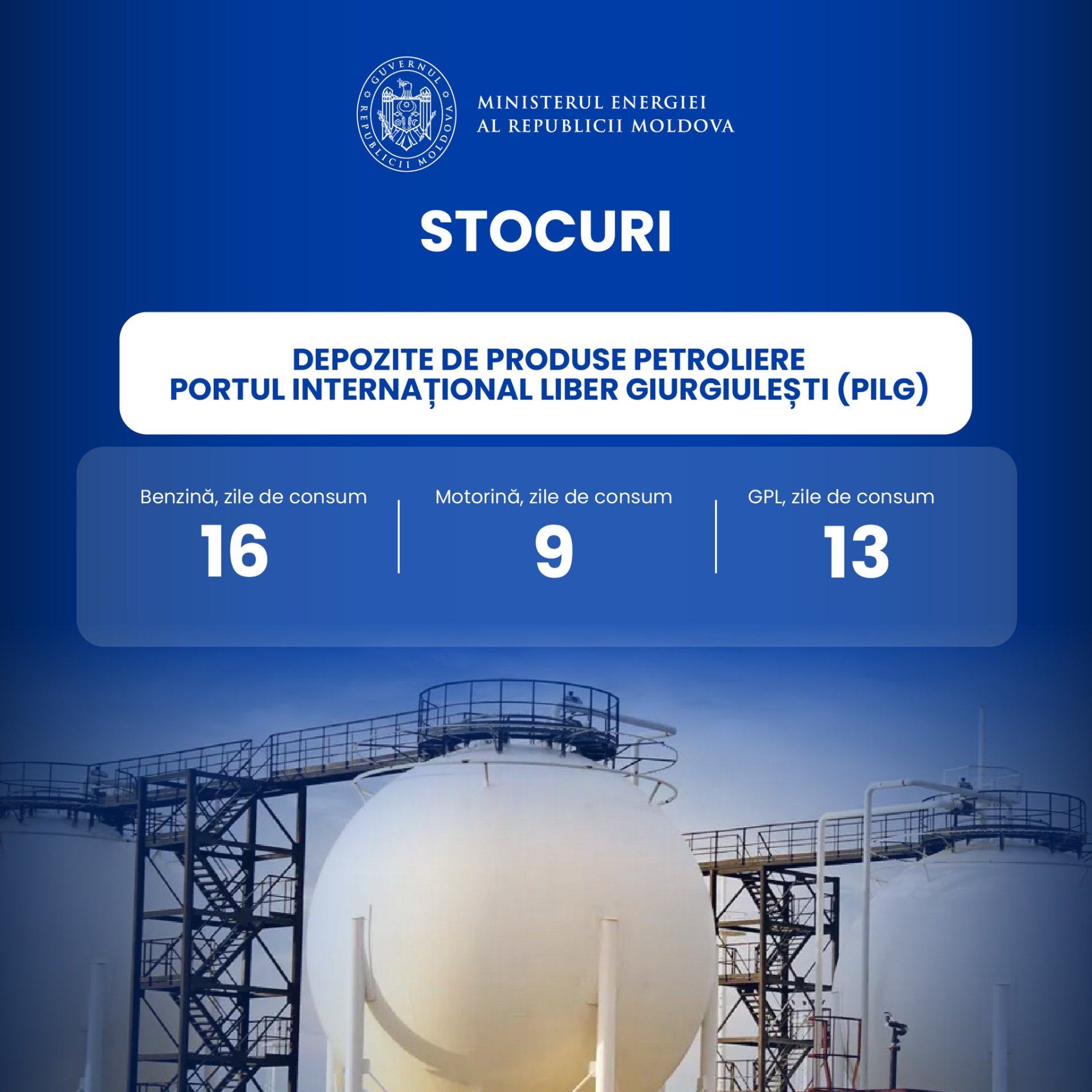 Potrivit datelor Ministerului Energiei, stocurile de carburanți se mențin la 9 zile de consum în cazul motorinei, 13 zile de consum în cazul Gazelor Petroliere Lichefiate (GPL), iar pentru benzină stocurile constituie 16 zile de consum, relevă datele Ministerului Energiei.