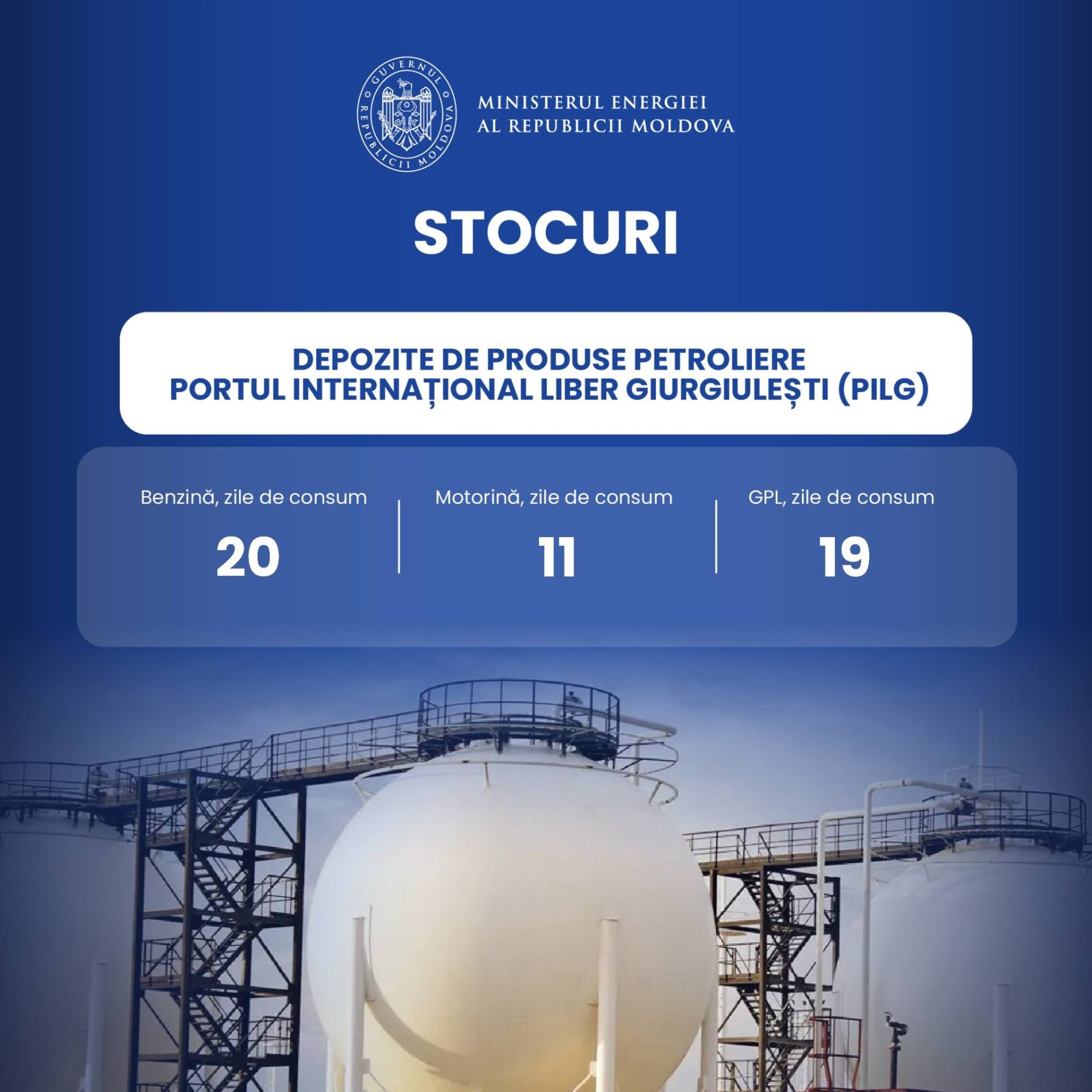 Potrivit Ministerului Energiei, la data de 17 aprilie, stocurile de combustibili au constituit 20 de zile de consum de benzină, 19 zile de GPL şi 11 zile de motorină.