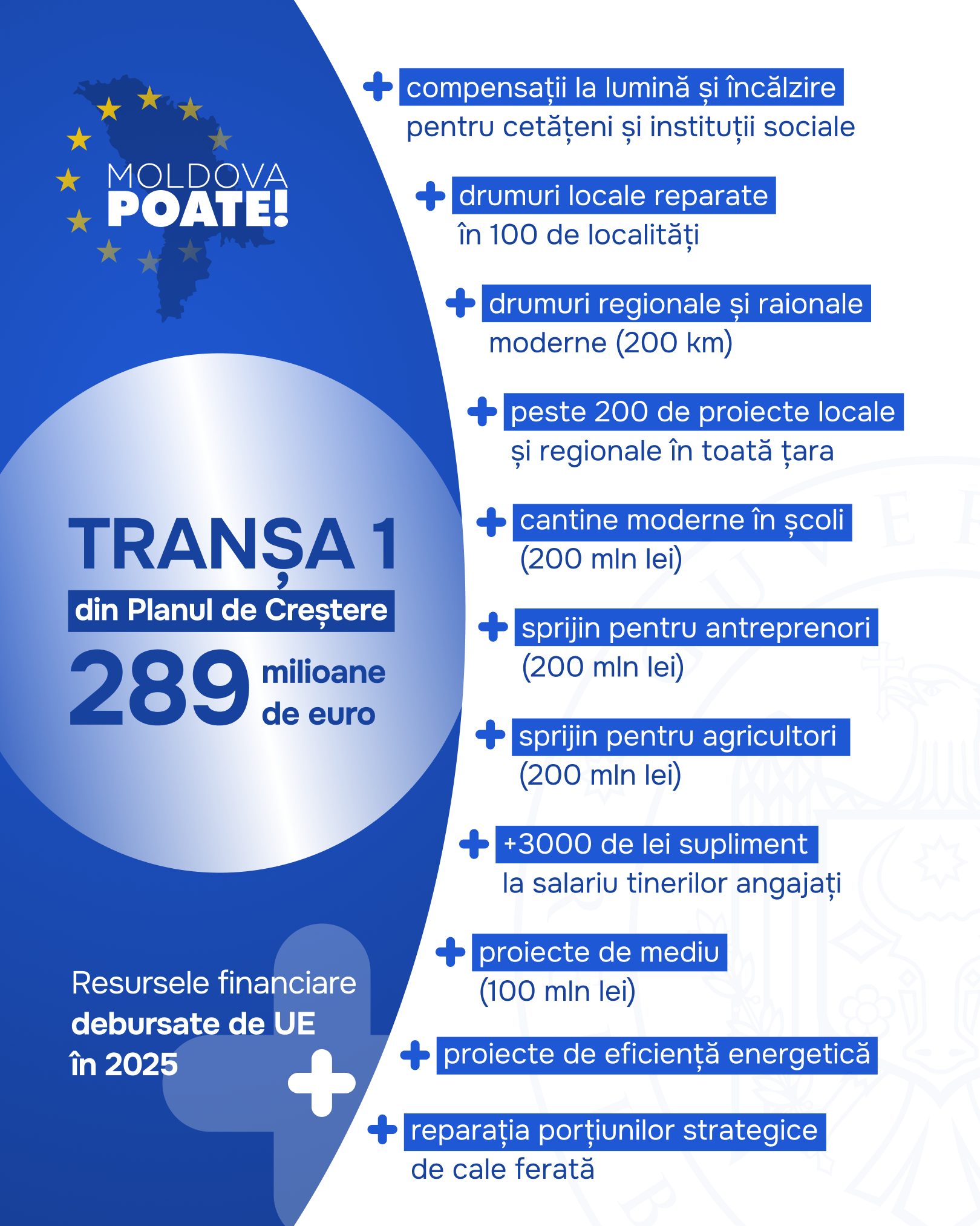 Planul de Creștere susținut de Uniunea Europeană este cel mai amplu și ambițios pachet de sprijin financiar din istoria Republicii Moldova în valoare de 1,9 miliarde de euro. Acordul de facilitate dintre Republica Moldova și Uniunea Europeană privind modalitățile specifice de punere în aplicare a sprijinului acordat de Uniunea Europeană în cadrul Mecanismului de Reformă și Creștere pentru Republica Moldova a fost semnat la 9 mai 2025.