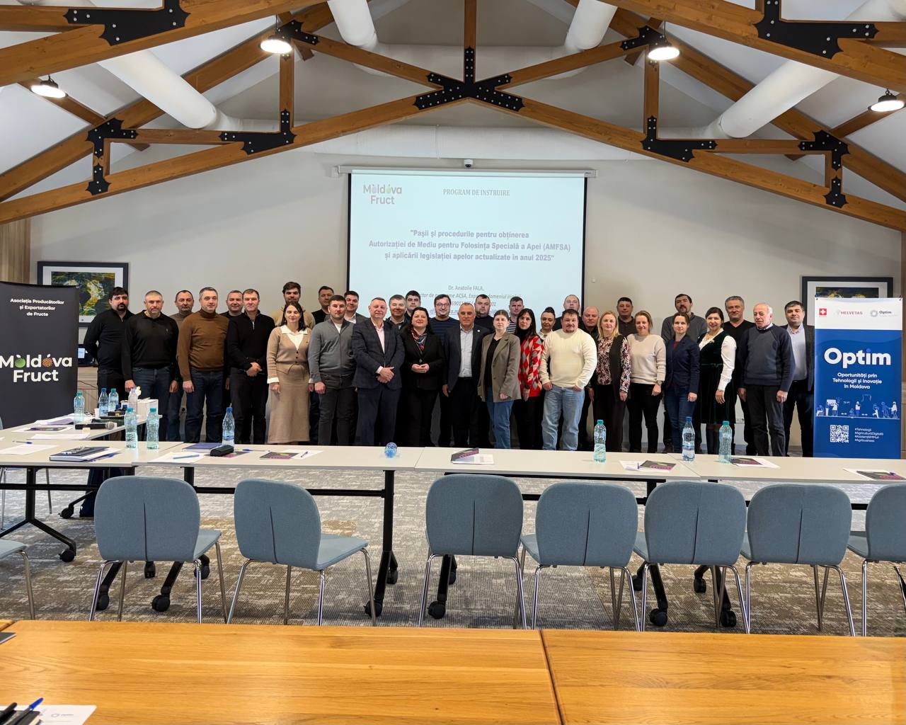 Peste 25 de producători de fructe din Republica Moldova au participat la un seminar practic dedicat obținerii Autorizației de Mediu pentru Folosința Specială a Apei (AMFSA) și aplicării legislației apelor actualizate pentru perioada 2025–2026. La instruire au fost prezenți și reprezentanți ai Ministerului Mediului, Ministerului Agriculturii și Industriei Alimentare, Inspectoratului pentru Protecția Mediului, Agenției de Mediu și Agenției Naționale de Îmbunătățiri Funciare.