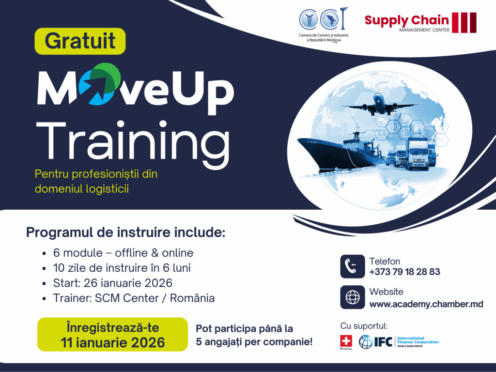 Profesioniștilor din domeniul transportului, logisticii și managementului lanțului de aprovizionare din Republica Moldova pot participa la programul de instruire MoveUp. Condițiile de participare au fost prezentate de Camera de Comerț și Industrie (CCI), informează MOLDPRES.