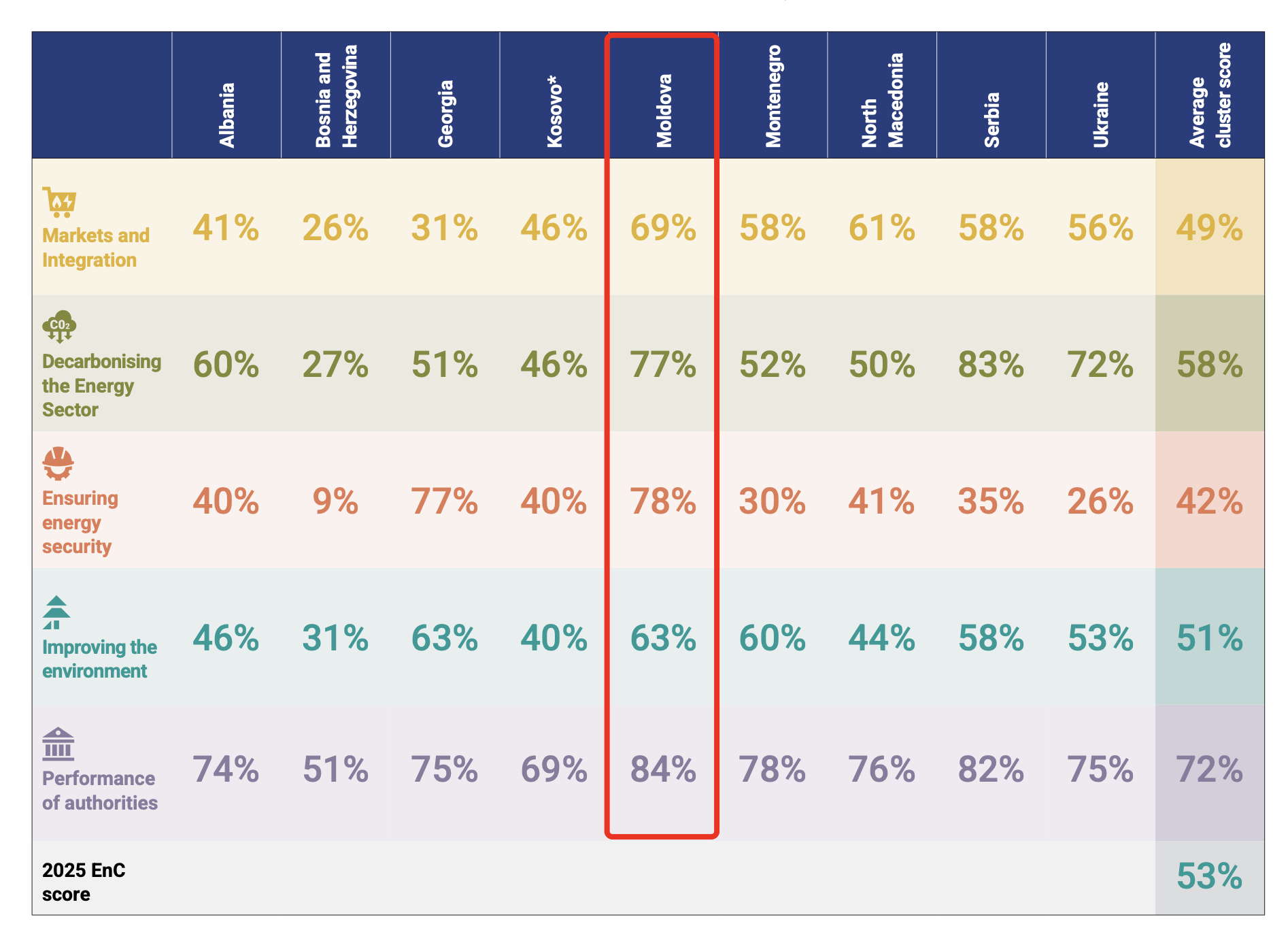 Astfel, la capitolul piețe și integrare, Moldova are un scor de 69%, decarbonizarea sectorului energetic – 77%, asigurarea securității energetice – 78%, îmbunătățirea mediului înconjurător – 63%, performanța instituțiilor statului – 84%.