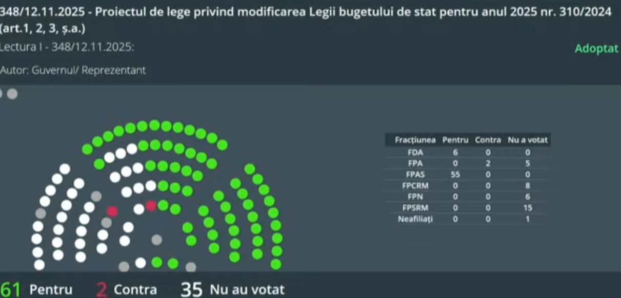 Parlamentul a adoptat în prima lectură proiectul de lege privind rectificarea bugetului de stat pentru 2025 cu voturile a 55 de deputați PAS și șase deputați din fracțiunea „Democrația Acasă”. Împotrivă s-au pronunțat doar doi deputați din fracțiunea „Alternativa”. Alți 35 de deputați (PSRM, PCRM, „Partidul Nostru” și cinci de la „Alternativa”) nu au votat, transmite MODLPRES.