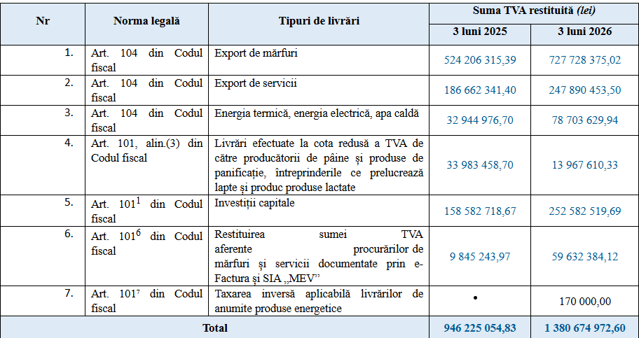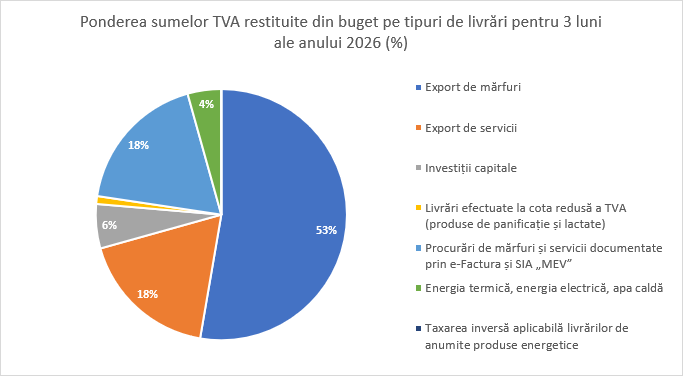 „Un element de noutate pentru trimestrul I al anului 2026 îl reprezintă implementarea primelor restituiri bazate pe mecanismul taxării inverse pentru anumite produse energetice, conform noilor modificări legislative intrate în vigoare la începutul anului. În același timp, investițiile capitale au continuat să fie un pilon important, sumele acceptate spre restituire pentru acest sector crescând considerabil față de anul precedent, fapt ce confirmă susținerea statului pentru dezvoltarea infrastructurii de afaceri și modernizarea capacităților de producție din Republica Moldova”, rezumă Serviciul Fiscal de Stat.