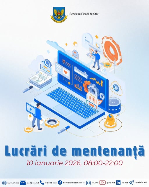 Serviciul Fiscal de Stat (SFS) anunţă contribuabilii și utilizatorii serviciilor fiscale electronice că, la data de 10 ianuarie 2026, până la ora 22:00, vor fi efectuate lucrări de mentenanță la nivelul sistemelor informatice ale instituției, transmite MOLDPRES.