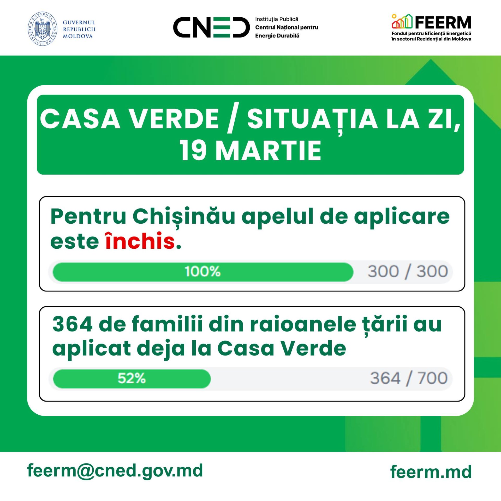 Sesiunea de aplicare la produsul de finanțare „Casa Verde” pentru municipiul Chișinău s-a încheiat, după ce plafonul maxim de proiecte pentru apelul II a fost atins în doar o zi și jumătate de la lansare, informează MOLDPRES.