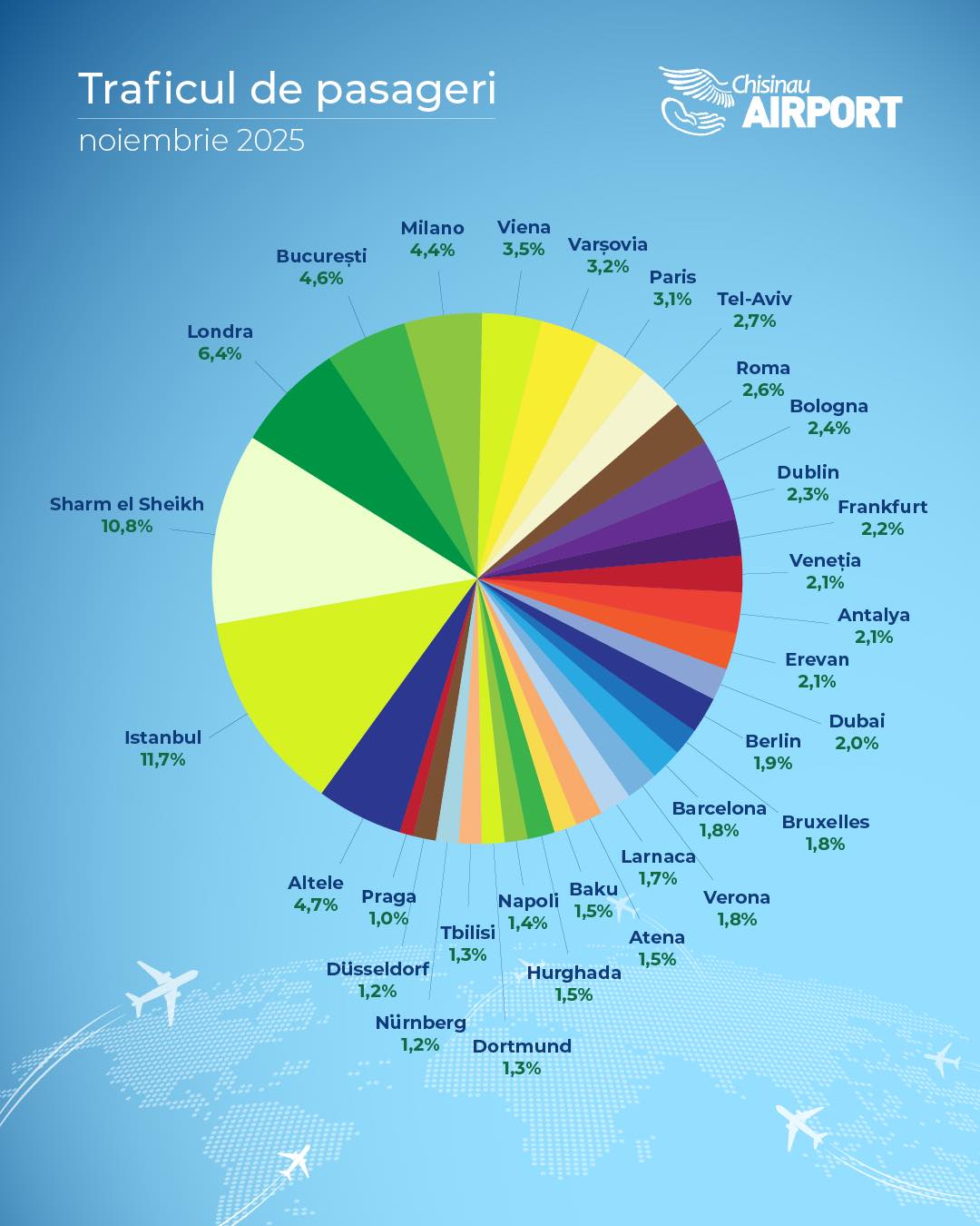 Trafic aerian în creștere pe Aeroportul Internațional „Eugen Doga” – Chișinău în luna noiembrie 2025