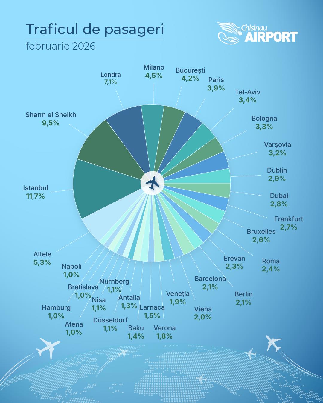 „Aceste cifre reflectă atât interesul crescut pentru destinații turistice, cât și mobilitatea sporită a moldovenilor spre diferite centre europene. Un factor important al creșterii traficului aerian îl reprezintă și extinderea rețelei de rute operate de companiile aeriene. Destinațiile introduse recent în programul de zbor au atras, doar în luna februarie, 25.004 pasageri, ceea ce reprezintă 6,89% din totalul traficului lunar”, explică sursa citată.