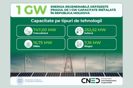 Republica Moldova a depășit pragul de 1 GW (Gigawatt) de capacitate instalată din surse de energie regenerabilă, atingând 1023,42 MW. Datele au fost prezentate astăzi de Centrul Național pentru Energie Durabilă (CNED), informează MOLDPRES.