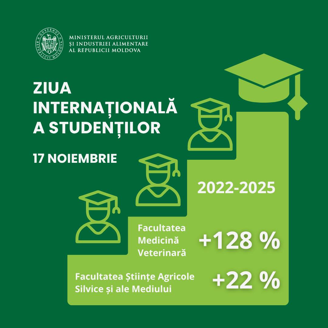 Datele Ministerului Agriculturii și Industriei Alimentare (MAIA) arată că, în perioada 2022–2025, Facultatea de Medicină Veterinară a înregistrat o creștere de 128% a numărului de studenți, iar Facultatea de Științe Agricole, Silvice și ale Mediului a crescut cu 22%.