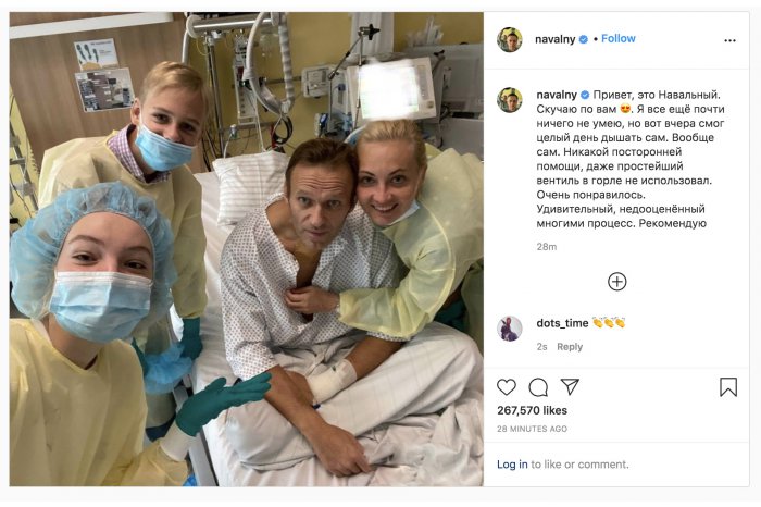 În fotografie, Navalnîi apare stând în pat şi înconjurat de familie, iar mesajul său este că acum poate respira fără asistenţă.