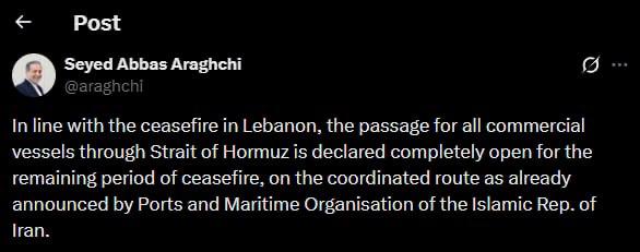 Autoritățile iraniene au anunțat redeschiderea traficului maritim prin Strâmtoarea Ormuz pentru toate navele comerciale, în contextul armistițiului în vigoare în Liban, a declarat ministrul de externe al Iranului, Abbas Araghchi, într-o postare publicată recent pe platforma X, transmite MOLDPRES.