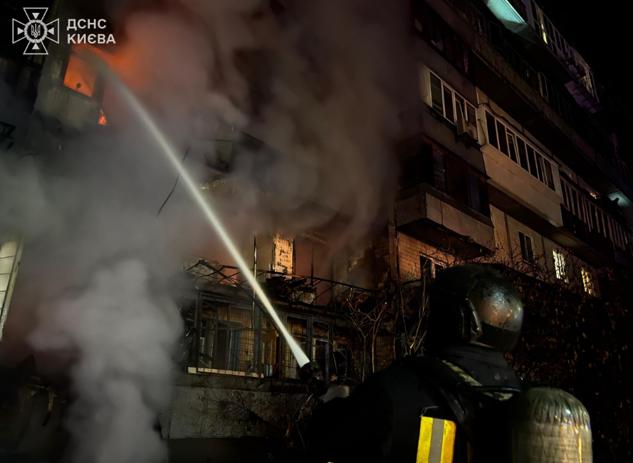 Șeful Administrației Militare a orașului Kiev, Tymur Tkacenko, a declarat că o clădire rezidențială cu 16 etaje a fost lovită în districtul Desnianskyi, provocând un incendiu.