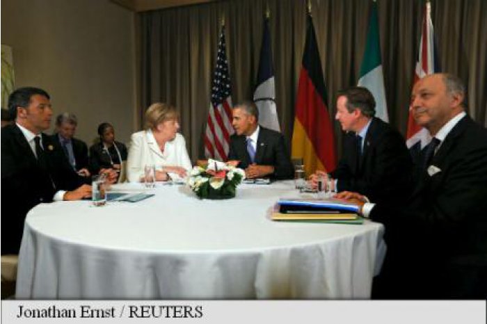 Președintele american, Barack Obama, cancelarul german, Angela Merkel, premierul britanic David Cameron, cel italian, Matteo Renzi, și ministrul francez de externe, Laurent Fabius, care l-a reprezentat la summit pe președintele francez, François Hollande, au avut o scurtă întîlnire aproape de încheierea summitului G20 de la Antalya.