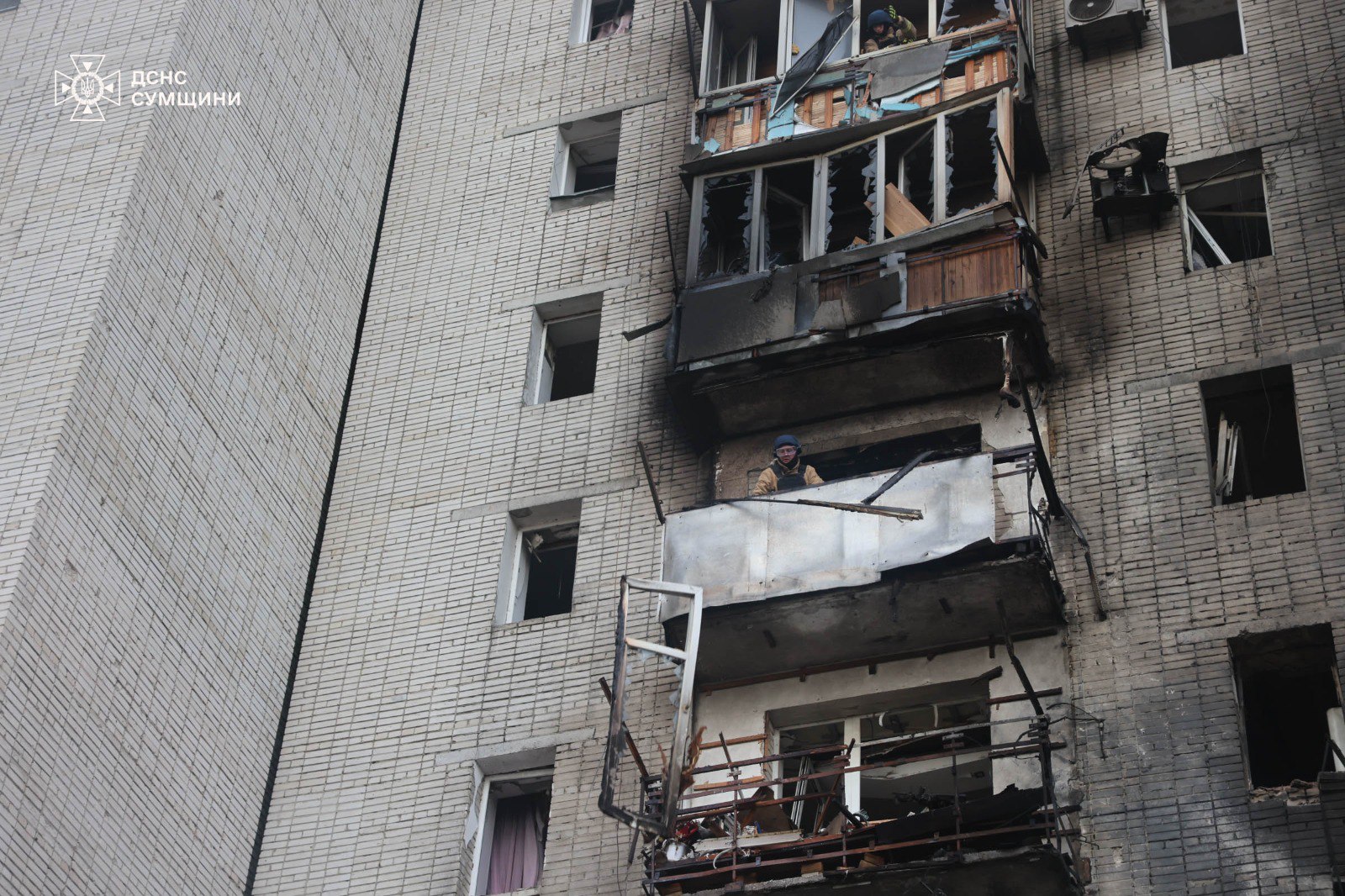 În regiunea Sumî, din nord-estul Ucrainei, o clădire rezidențială cu mai multe etaje a fost lovită într-un atac cu drone, rănind șapte civili, au declarat oficialii.
