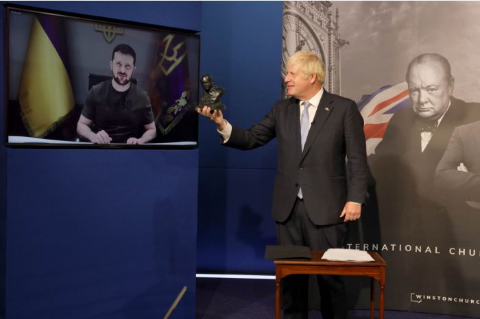 Șeful statului ucrainean a participat prin videoconferinţă la ceremonia din Downing Street 10 - reşedinţa oficială a prim-ministrului de la Londra - unde Johnson a afirmat că Churchill "ar fi izbucnit în urale şi probabil ar fi şi lăcrimat" când şeful statului ucrainean a cerut "muniţie, nu o ocazie" cu care să plece de la Kiev când a început invazia rusă.