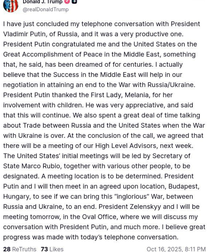 „Întâlnirile inițiale ale Statelor Unite vor fi conduse de secretarul de stat Marco Rubio (...). Ulterior, președintele Putin și cu mine ne vom întâlni într-un loc agreat – Budapesta, Ungaria – pentru a vedea dacă putem pune capăt acestui ‘război fără glorie’ dintre Rusia și Ucraina”, a declarat Trump.