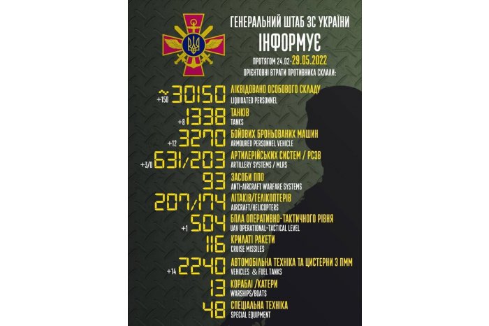 Kievul susţine astfel că a „lichidat” un număr de 30.150 militari ruşi. Cifrele nu pot fi confirmate independent, iar ultimul bilanţ al pierderilor armatei ruse publicat oficial de Moscova a fost pe 25 martie, conform căruia 1.351 de militari ruşi au fost ucişi în Ucraina.