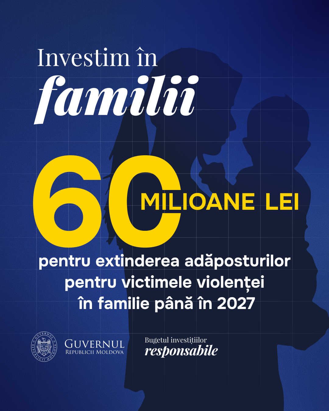 Centre noi de adăpost pentru femei și fete - victimele violenței în familie, vor fi deschise în Telenești, Ștefan Vodă și Cahul. Această investiție va mări numărul total de locuri la nivel național cu 23%. Până în anul 2027 vor fi investite 60 milioane de lei în extinderea rețelei naționale de adăposturi pentru victimele violenței în familie, pentru ca fiecare femeie și copil aflat în pericol să beneficieze de acces imediat la un loc sigur.
