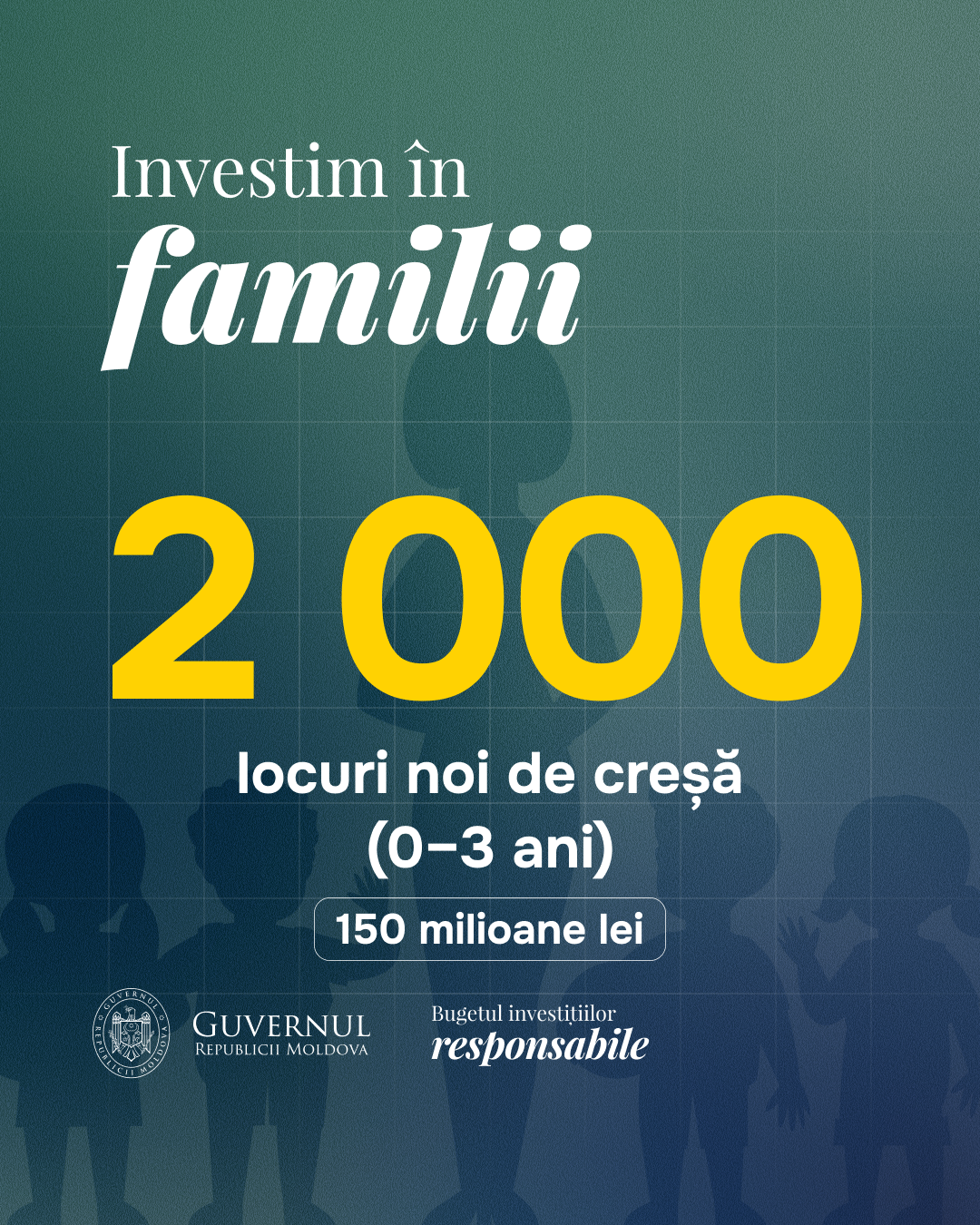 Bugetul prevede crearea a 2 000 de locuri de creșe noi pentru copiii de vârsta 0-3 ani, astfel încât mai multe femei să poată reveni pe piața muncii. Pentru circa 750 de copii rămași fără îngrijire părintească, vor fi angajați 33 de asistenți parentali profesioniști pentru plasamentul de urgență al copiilor aflați în situație de risc.