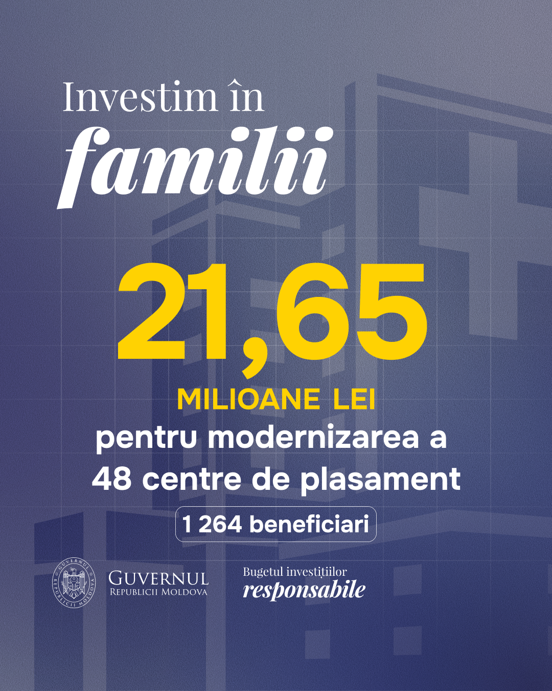 Pentru familiile persoanelor cu dizabilități, vor fi deschise 6 servicii noi „Respiro” - adițional la cele 7 existente. De asemenea, 21,65 milioane de lei vor fi investite în infrastructura a 48 de centre de plasament și de zi, îmbunătățind condițiile pentru peste o mie de beneficiari.