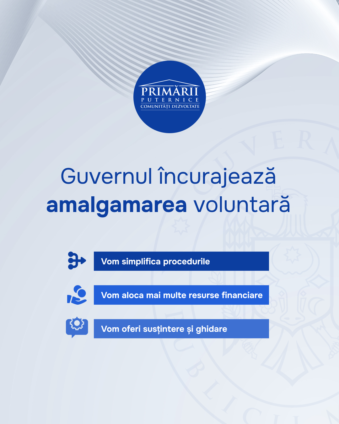 În paralel, a fost accentuat faptul că Guvernul încurajează amalgamarea voluntară. Procedurile vor fi simplificate, vor fi alocate mai multe resurse financiare și oferit sprijin operațional și ghidare.