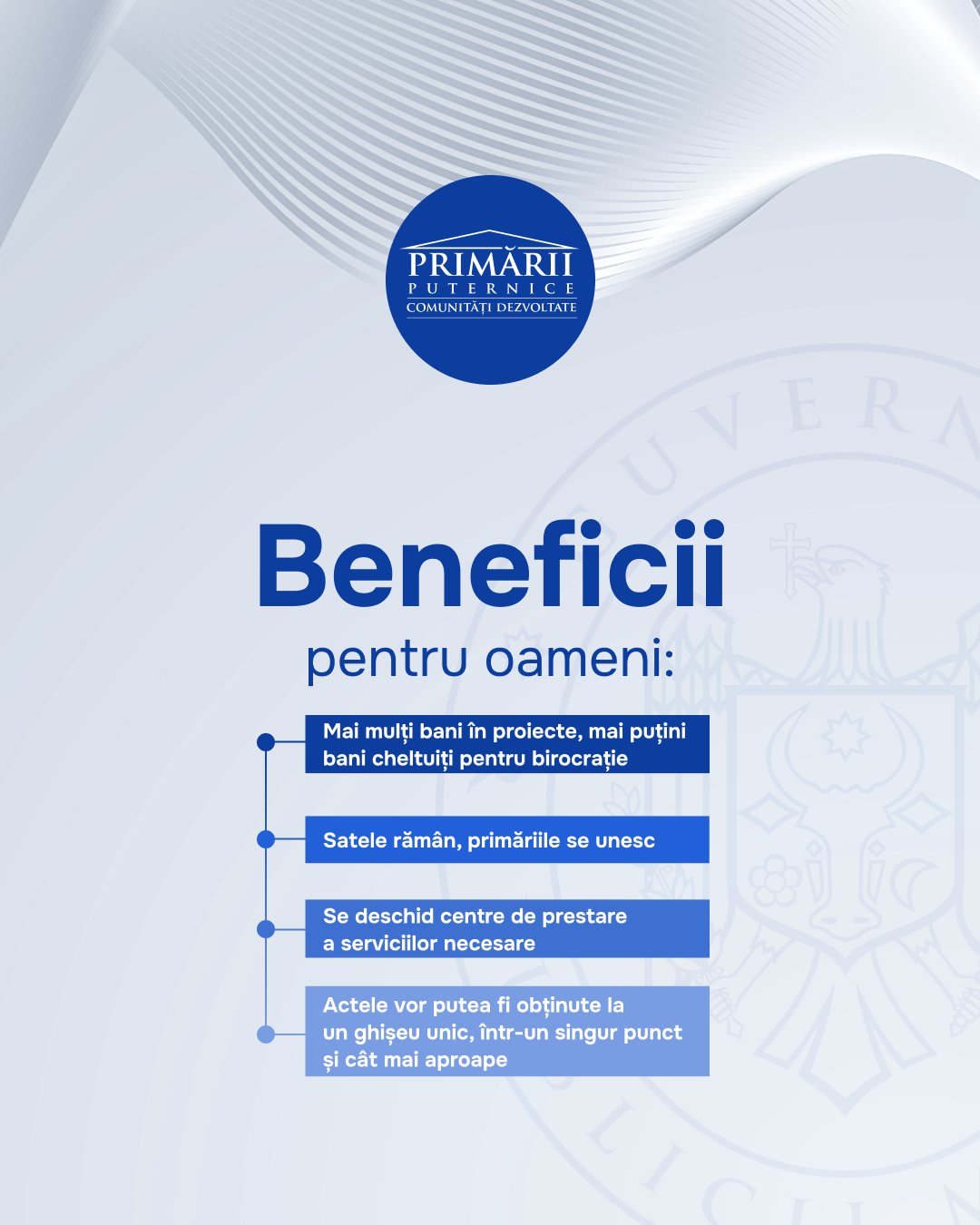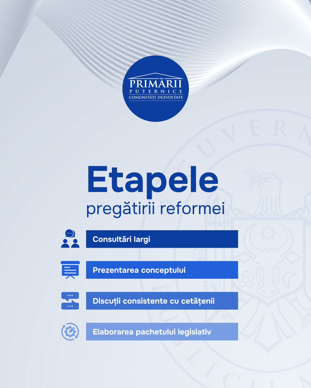 În următoarele săptămâni vor avea loc discuții cu primarii, cu experții, cu autoritățile raionale și locale, precum și cu societatea civilă. Cancelaria de Stat îndeamnă toți cetățenii, primarii, societatea civilă să participe la consultări, inclusiv prin expedierea propunerilor la adresa primăriiputernice@gov.md.