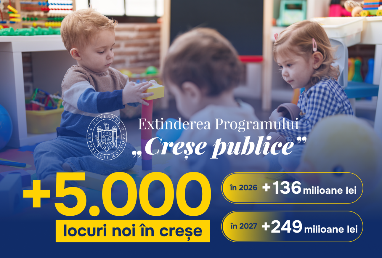 Guvernul va aloca 385,7 milioane de lei pentru extinderea creșelor în anii 2026-2027. Astfel, vor fi create până la 5000 de locuri de creșă, va fi finanțată extinderea grupelor existente și crearea unor grupe noi, inclusiv construcția anexelor. Lansarea noului apel de concurs în cadrul Programului Național „Servicii de creșe publice – Părinți angajați, copii la creșe”, a fost anunțat de Viceprim-ministrul, Ministrul Infrastructurii și Dezvoltării Regionale, Vladimir Bolea, și Ministra Muncii și Protecției Sociale, Natalia Plugaru.