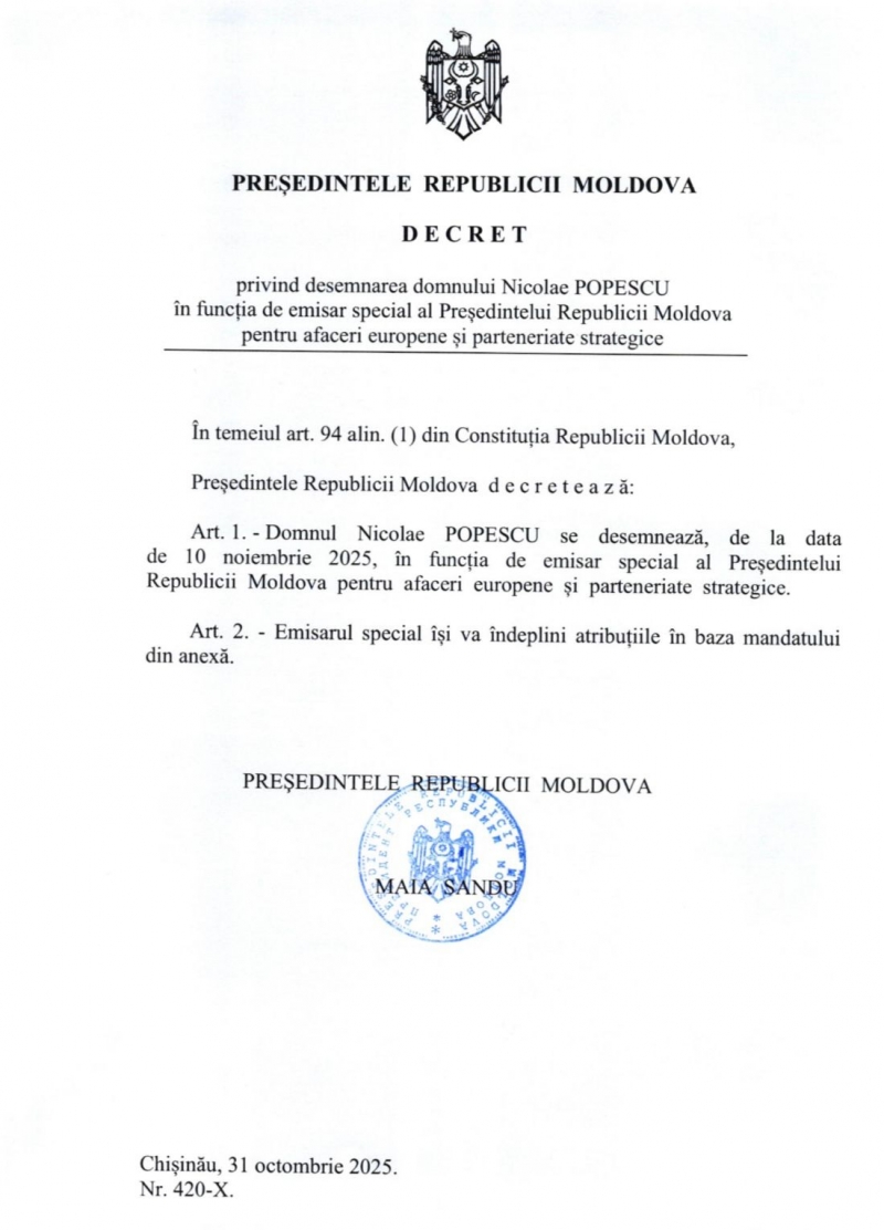 Președinta Republicii Moldova, Maia Sandu, a semnat decretul privind numirea domnului Nicu Popescu în funcția de emisar special pentru afaceri europene și parteneriate strategice.