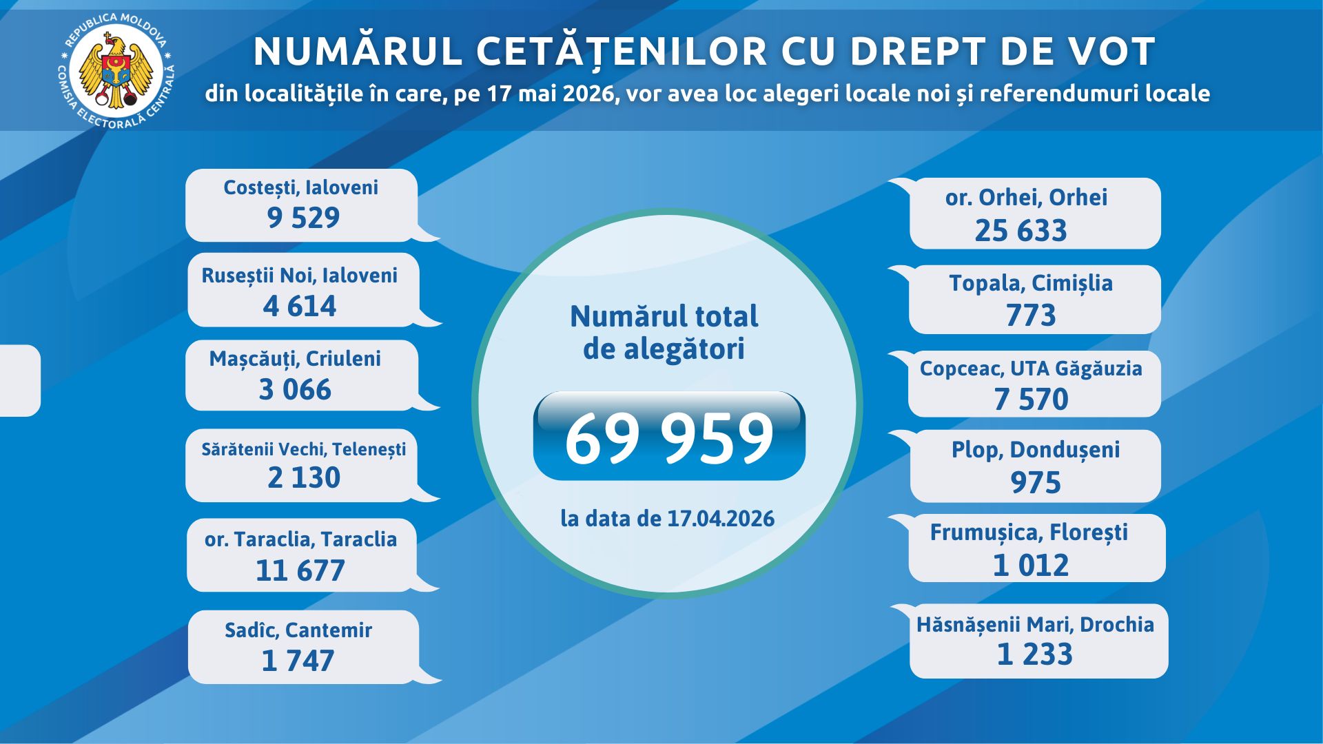 Aproximativ 70 de mii de cetățeni cu drept de vot sunt așteptați la urne pe 17 mai 2026, în cadrul alegerilor locale noi și al referendumurilor locale, comunică MOLDPRES.