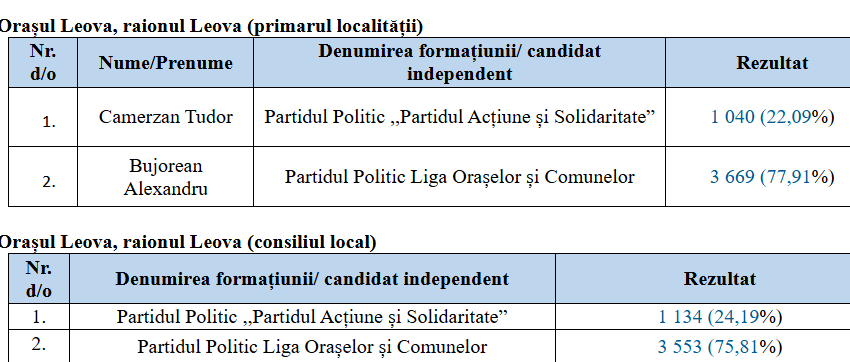 Pentru Alexandru Bujoreanu au votat 3.669 de alegători sau 77,91%, arată datele preliminare publicate de Comisia Electorală Centrală (CEC). Contracandidatul său, Tudor Camerzan, candidat al Partidului Acțiune și Solidaritate (PAS), a acumulat 1.040 de voturi sau 22,09%.