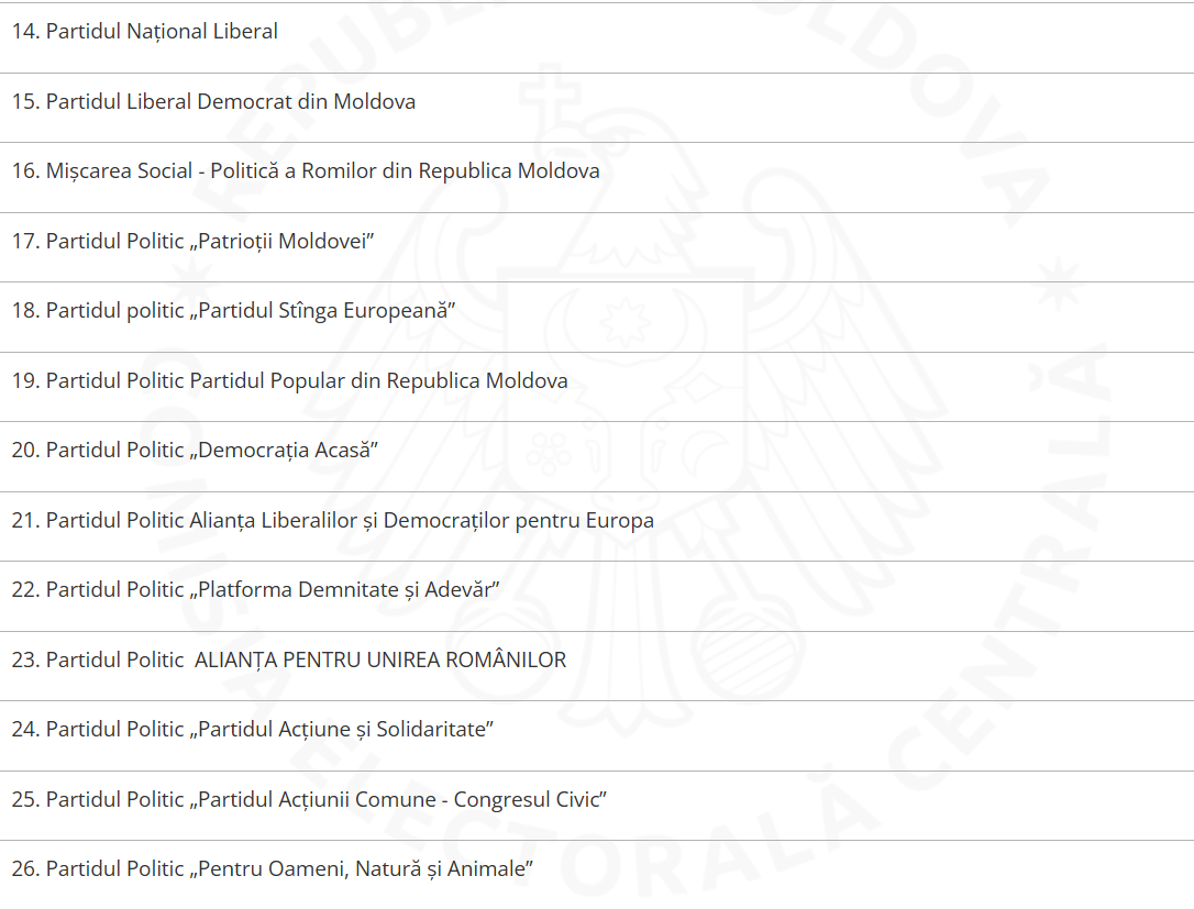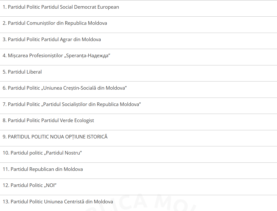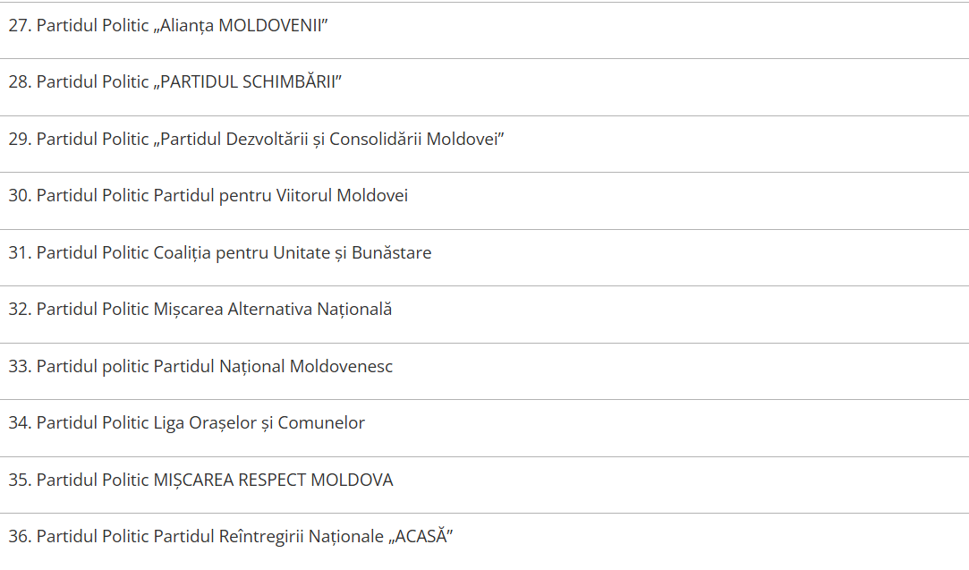 Astfel, potrivit informațiilor oferite de Agenția Servicii Publice, din cele 66 partide politice înregistrate în Registrul de stat al persoanelor juridice la situația din 16 februarie 2026, 36 partide politice au prezentat informația necesară, fiind stabilită admisibilitatea acesteia, precum și activitatea acestora nu este limitată și/sau încetată.