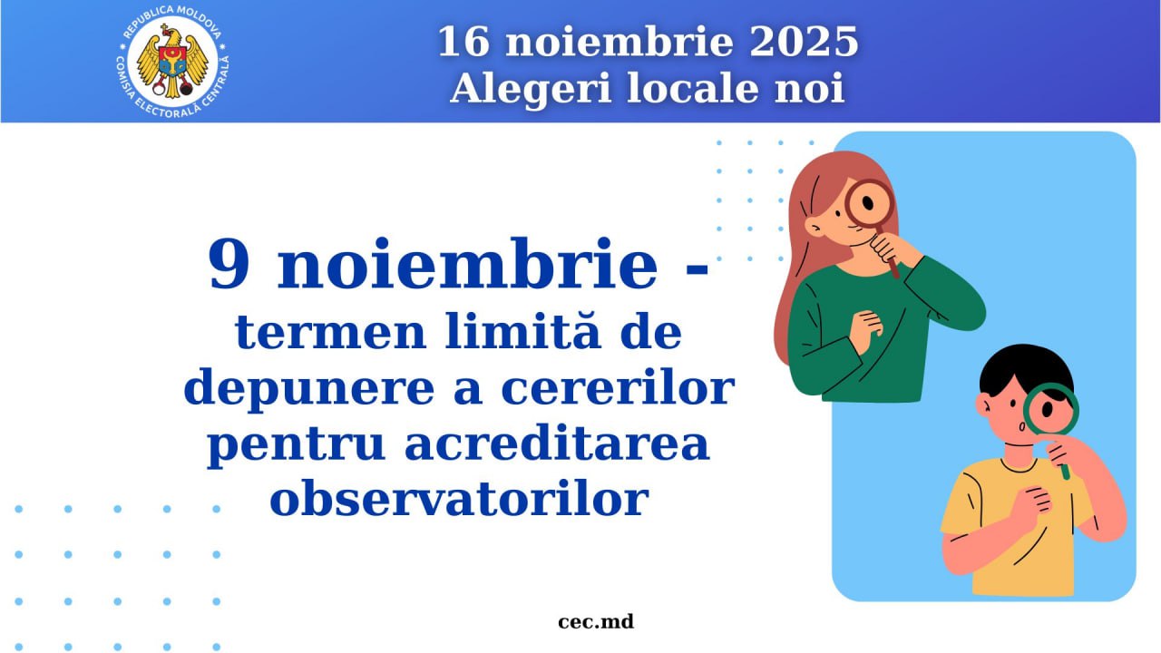 Comisia Electorală Centrală (CEC) a anunțat că data de 9 noiembrie 2025 este termenul-limită pentru depunerea cererilor de acreditare a observatorilor care vor monitoriza alegerile locale noi din 16 noiembrie, transmite MOLDPRES.