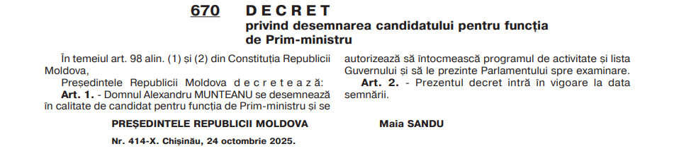 Decretul președintei Republicii Moldova, Maia Sandu, prin care Alexandru Munteanu este desemnat candidat la funcția de prim-ministru, a fost publicat astăzi în „Monitorul Oficial”, marcând începutul procesului oficial de constituire a noului Executiv, transmite MOLDPRES.