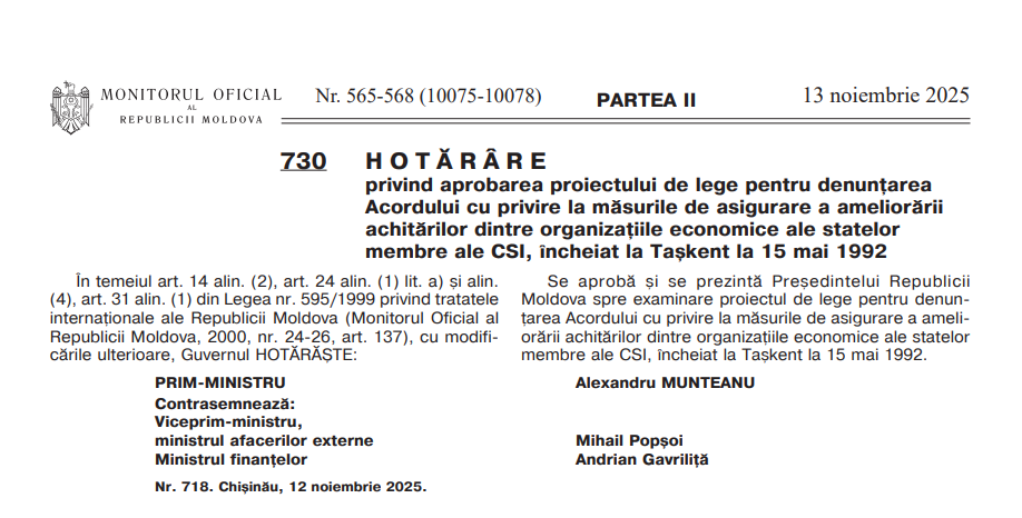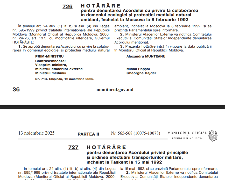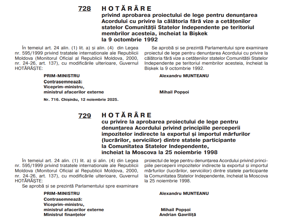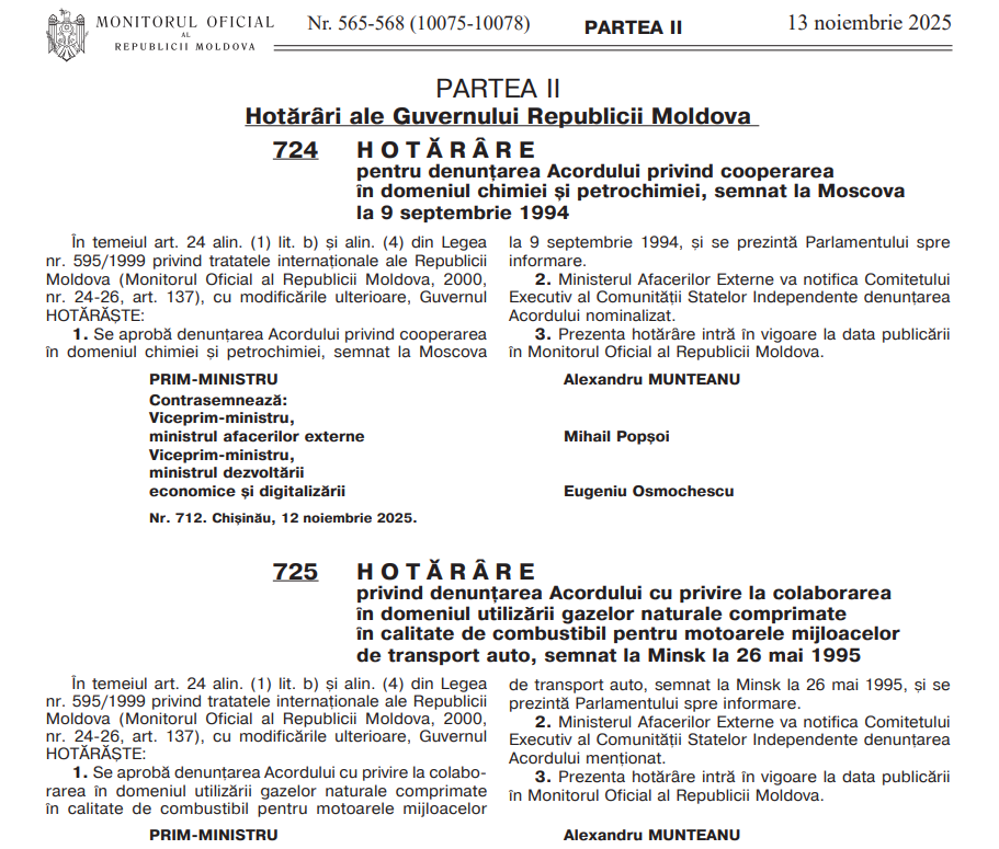 DOC // Deciziile Guvernului privind denunțarea a șapte Acorduri încheiate cu statele membre ale CSI, publicate în Monitorul Oficial