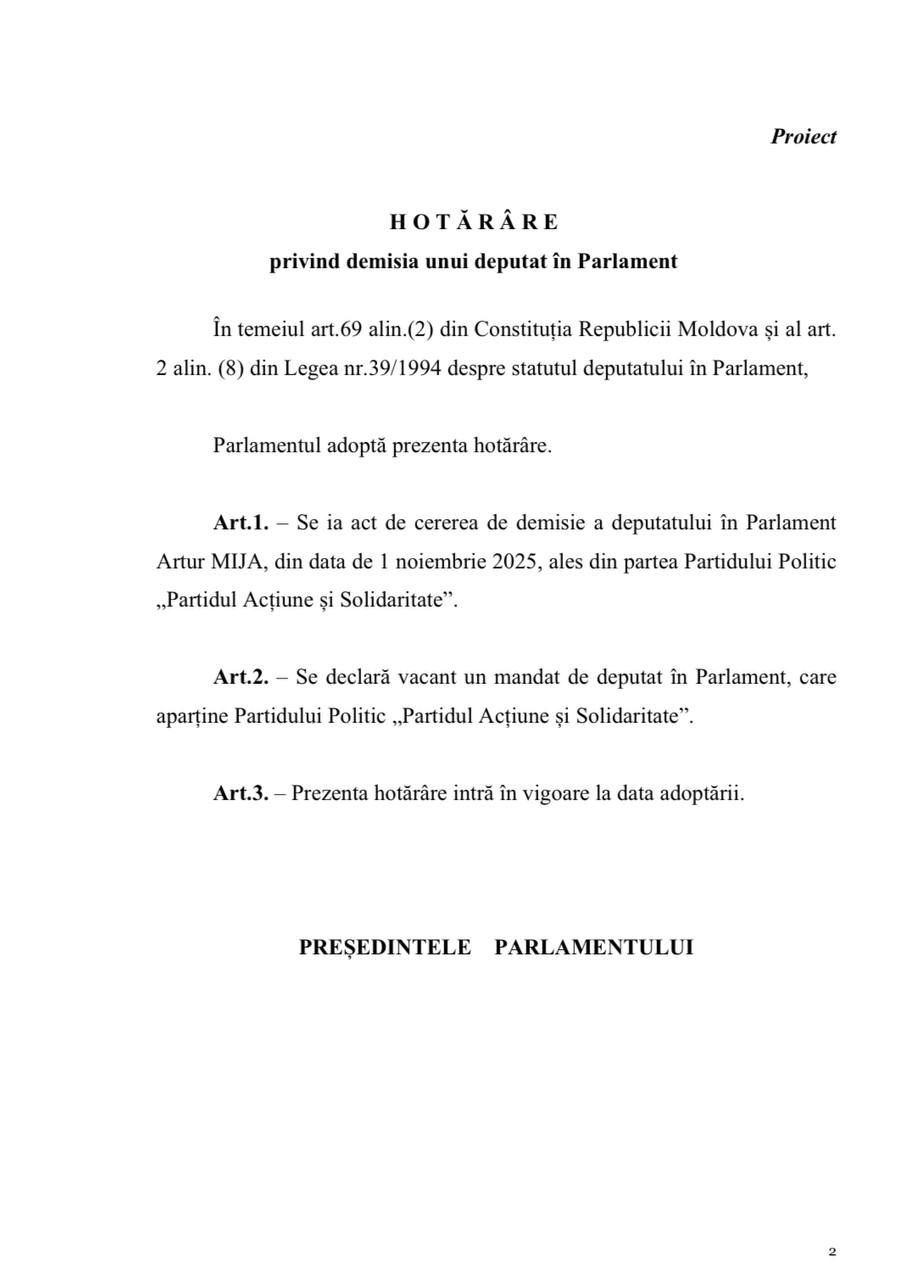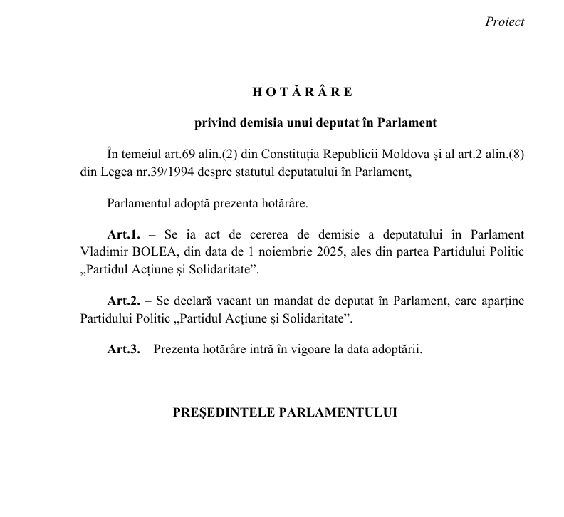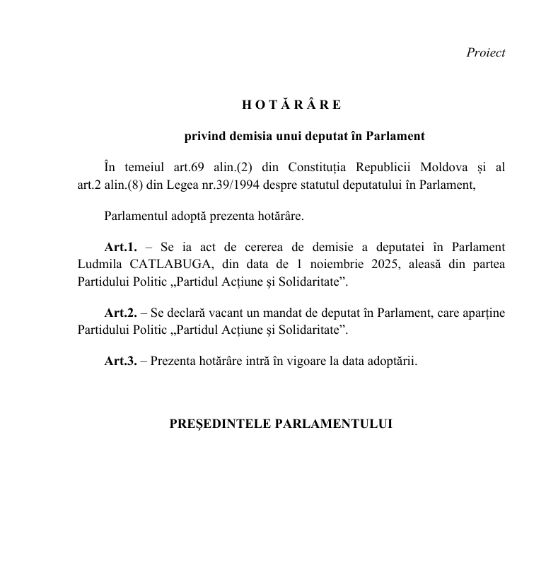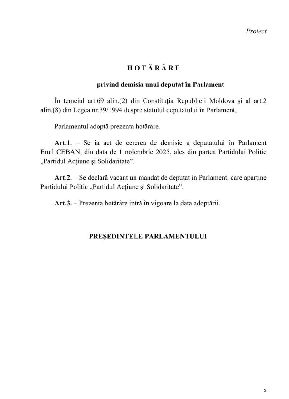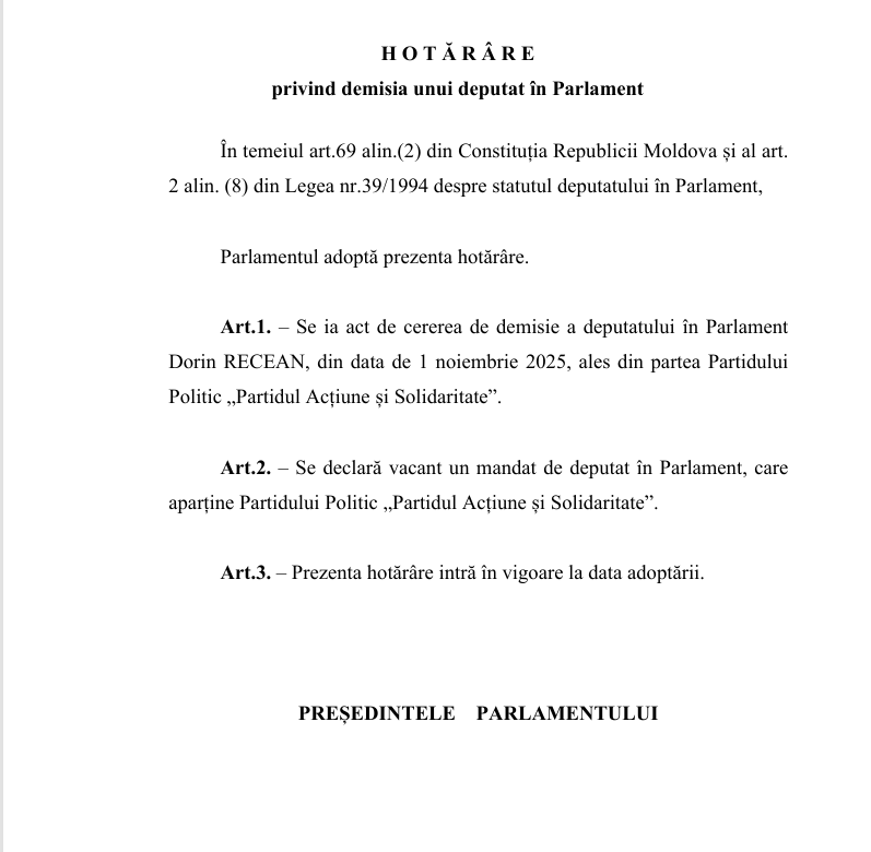 Conform hotărârii de Parlament, se ia act de cererile de demisie din data de 1 noiembrie 2025. În conformitate cu Legea despre statutul deputatului, mandatele vacante vor fi atribuite supleanților imediat următori de pe lista concurentului electoral „Partidul Acțiune și Solidaritate”. Este vorba despre: Igor Talmazan, Angela Munteanu-Pojoga, Veronica Cupcea, Veronica Briceag, Liliana Grosu, Alexandr Trubca, Gheorghe Ichim și Valeriu Carțîn.