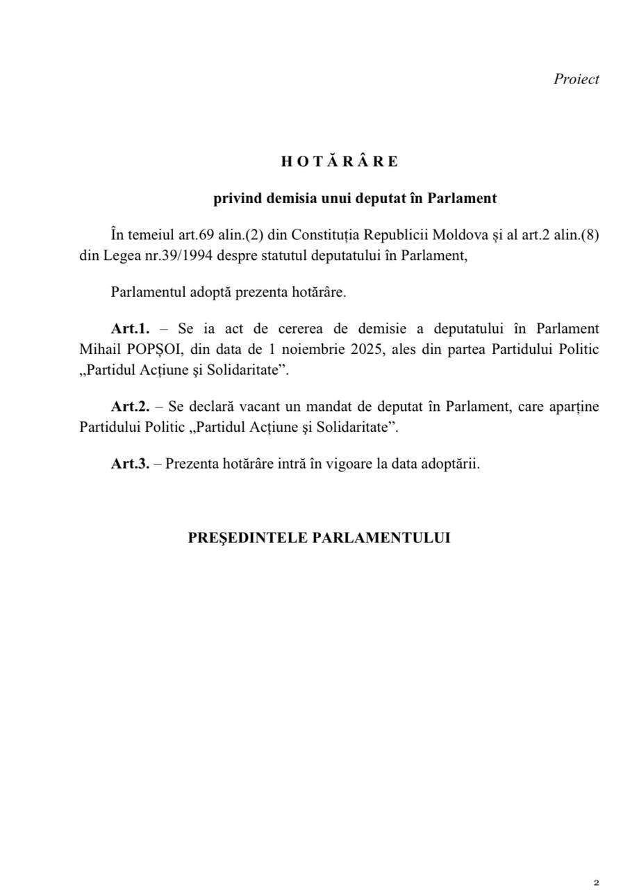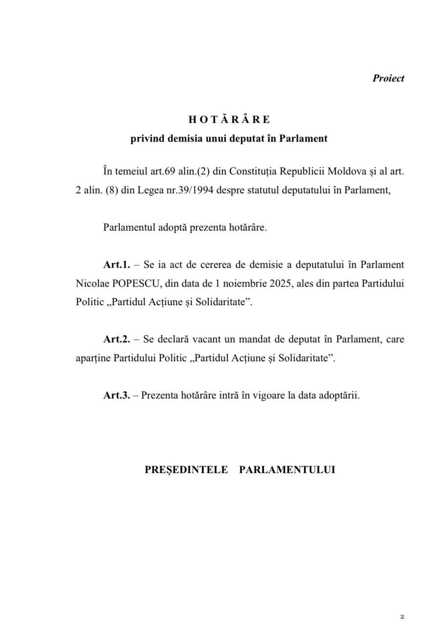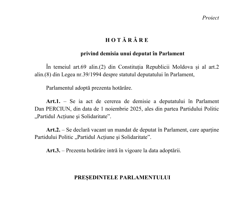 Conform hotărârii de Parlament, se ia act de cererile de demisie din data de 1 noiembrie 2025. În conformitate cu Legea despre statutul deputatului, mandatele vacante vor fi atribuite supleanților imediat următori de pe lista concurentului electoral „Partidul Acțiune și Solidaritate”. Este vorba despre: Igor Talmazan, Angela Munteanu-Pojoga, Veronica Cupcea, Veronica Briceag, Liliana Grosu, Alexandr Trubca, Gheorghe Ichim și Valeriu Carțîn.