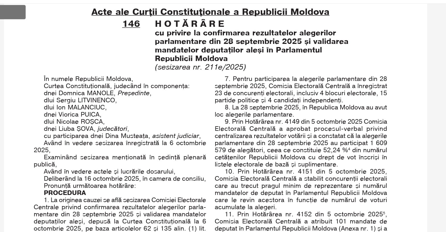 Curtea Constituțională a confirmat rezultatele alegerilor parlamentare din 28 septembrie 2025 și a validat mandatele celor 101 deputați aleși în noul Legislativ. Hotărârea a fost publicată în Monitorul Oficial al Republicii Moldova, comunică MOLDPRES.
