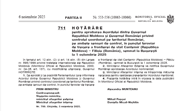 Hotărârea Guvernului de aprobare a Acordului privind implementarea controlului coordonat la punctul feroviar Cantemir-Fălciu a fost publicată în Monitorul Oficial. Acesta va fi al treilea punct de trecere a frontierei cu România, care urmează să activeze în baza conceptului de control coordonat, transmite MOLDPRES.