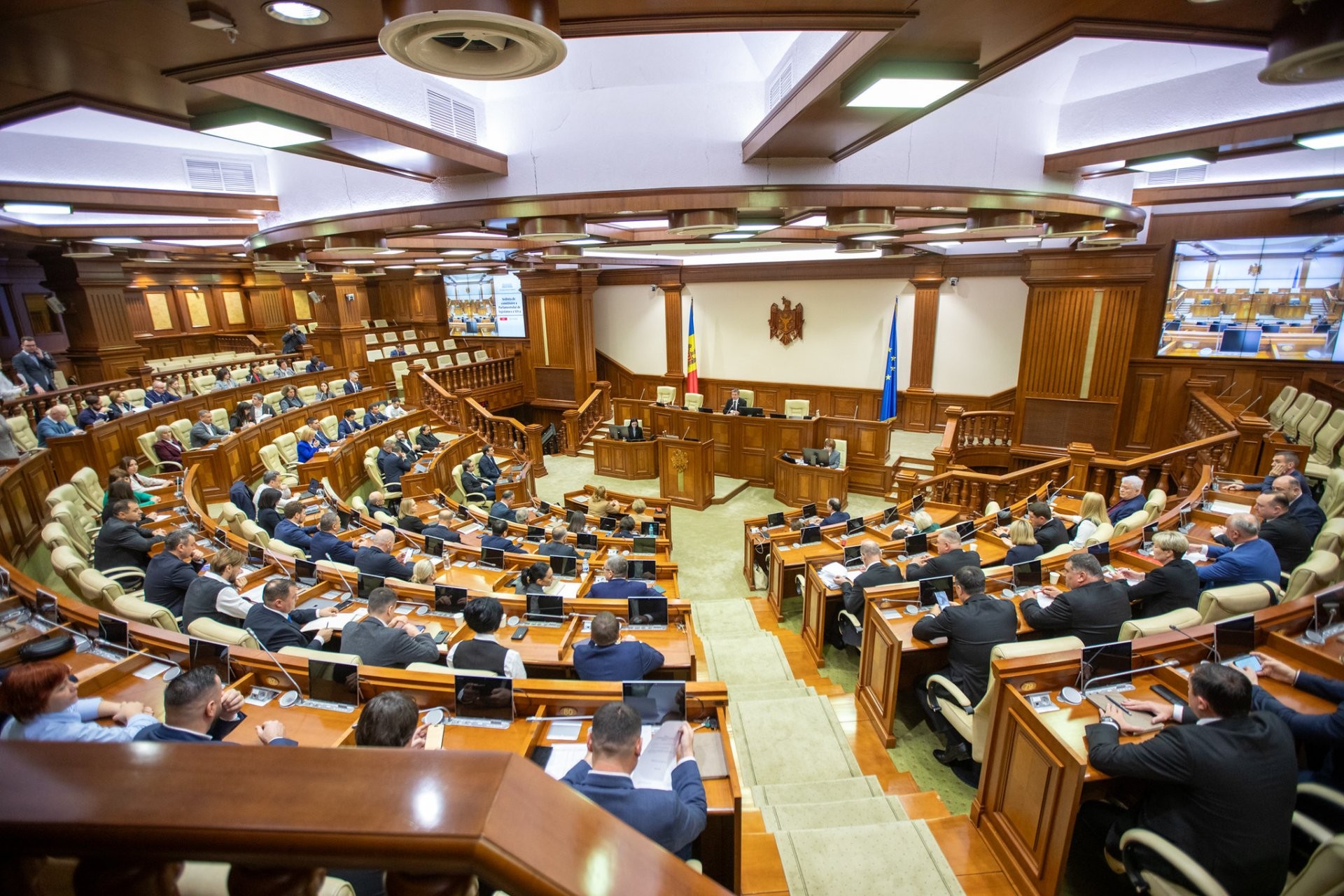 La ședință participă 99 de deputați. Nu și-au anunțat prezenta Constantin Starîș și Nicolae Botgros.