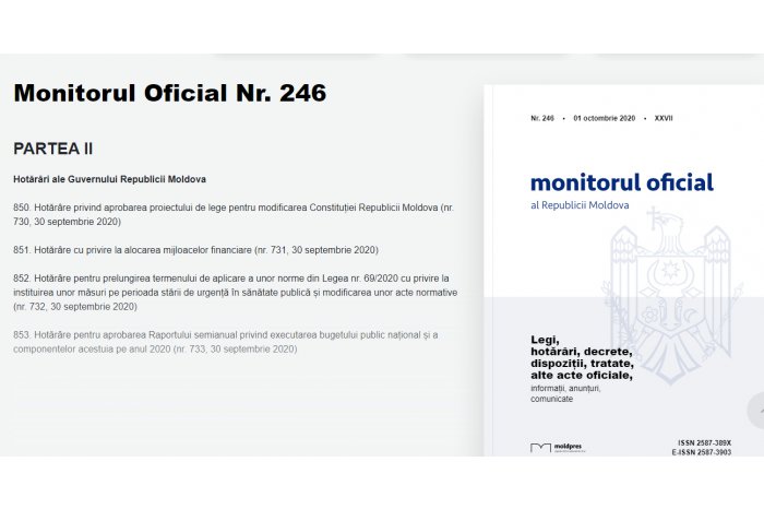 Chişinău, 1 oct. /MOLDPRES/. Monitorul Oficial din 1 octombrie a publicat hotărârea Guvernului privind aprobarea proiectului de lege pentru modificarea Constituției Republicii Moldova. Executivul a votat proiectul, solicitând asupra acestuia Avizul Curții Constituționale și prezentându-le ulterior Parlamentului spre examinare, transmite MOLDPRES.