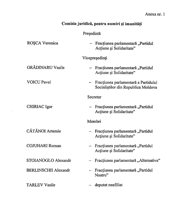 Printre acestea se numără Comisia juridică, pentru numiri și imunități, care va avea nouă membri și va fi condusă de Veronica Roșca. Activitatea acesteia vizează reglementările constituționale, precum și cele din domeniile civil, penal, administrativ și contravențional, activitatea judecătorească și a procuraturilor, precum și legislația electorală.