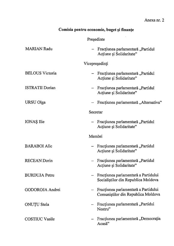 Comisia pentru economie, buget și finanțe va avea unsprezece membri și va fi prezidată de Radu Marian. Printre atribuțiile acesteia se numără elaborarea cadrului legal privind politica dezvoltării durabile și asigurarea creșterii economice, politica bugetară, fiscală și vamală, precum și activitatea investițională.