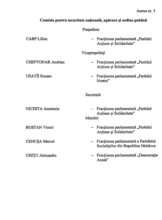 Comisia pentru securitate națională, apărare și ordine publică va fi compusă din șapte membri și va fi condusă de Lilian Carp. Aceasta va gestiona domeniile securității naționale, combaterii criminalității, corupției și terorismului, circulației rutiere și protecției datelor cu caracter personal.