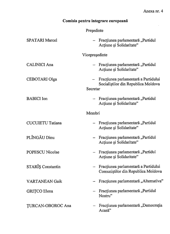 Comisia pentru integrare europeană este formată din 11 membri și va fi condusă de deputatul Marcel Spatari. Aceasta a fost creată pentru a accelera procesul de aderare la UE și pentru a asigura o transpunere eficientă a normelor europene în legislația națională.