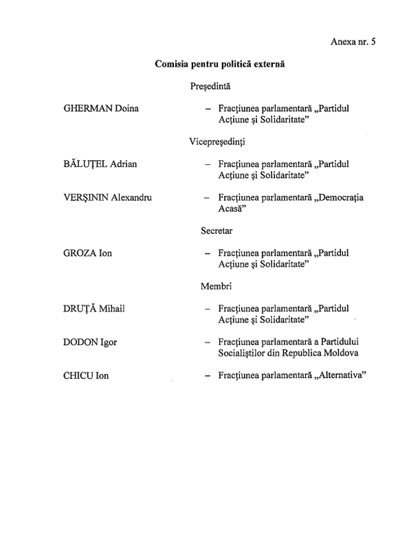 Comisia pentru politică externă va fi condusă de Doina Gherman și va avea șapte membri. Printre domeniile sale de activitate se numără cooperarea cu parlamentele altor state, avizarea tratatelor și a altor acte internaționale.