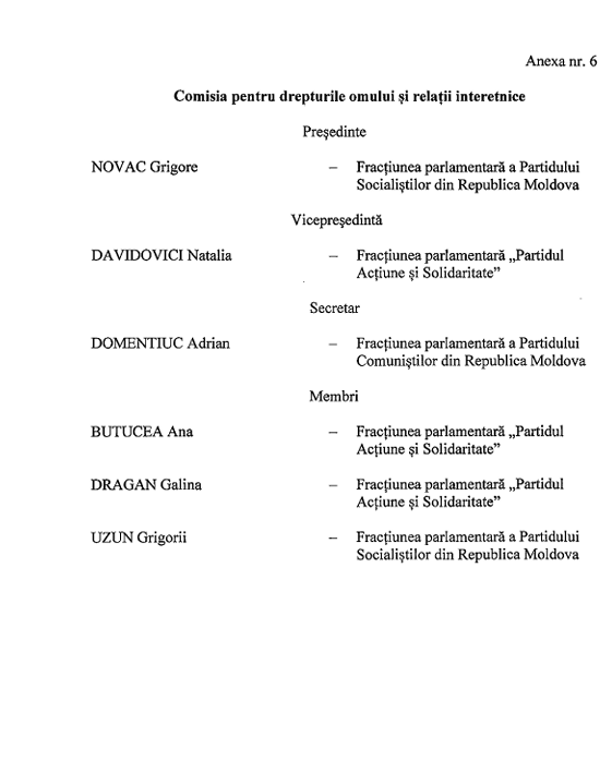 Comisia pentru drepturile omului și relații interetnice este formată din șase membri și este condusă de Grigore Novac. Domeniile de activitate includ protecția drepturilor omului, problemele minorităților naționale, cetățenia Republicii Moldova și reglementările juridice în domeniul migrației.